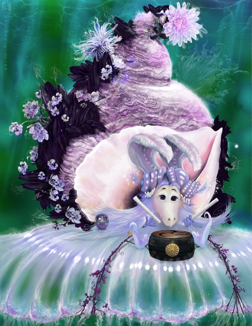 This is Kanon — which in Japanese means “flower sound”! Isn’t that wonderful?? : ) She’s a proactive energetic hermit crab from Taiji fed up with misguided humans polluting her cove with blood from murdered dolphins. She’s headed out to drum up support — she’ll get it!