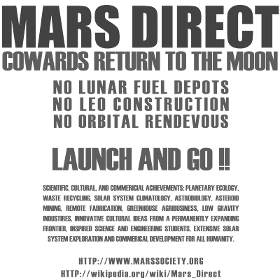 While such a populist theme may seem blunt, rude, or whatever, over the last decade of involvement in space advocacy we’ve observed a remarkably consistent dichotomy between persons involved in the space community: old political timid bureaucrat predictably favor lunar exploration, with their excuse being “safety, proximity to earth”; bold young creative entrepreneurs OVERWHELMINGLY favor Mars Direct, with their rally cry being, “LET’S GO!”