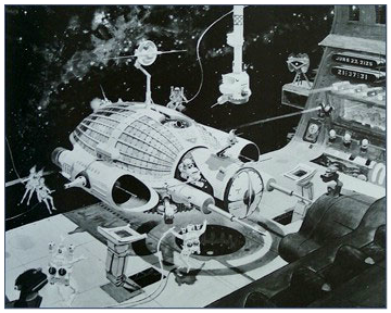 Station,” which shows a space vehicle darting from the lit bay of a wheel-shaped space station,