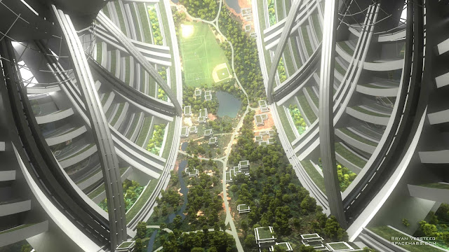 The image below, by Phil Smith, depicts a large, open, multi-story masonry structure located deep within hillsides. Natural sunlight is directed into this area from lightpipes above. A Mars settler leans on the bamboo rail and takes in the view, which includes lush greenery and wide open spaces.