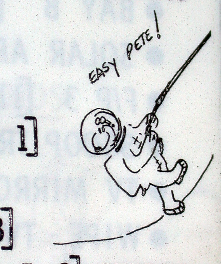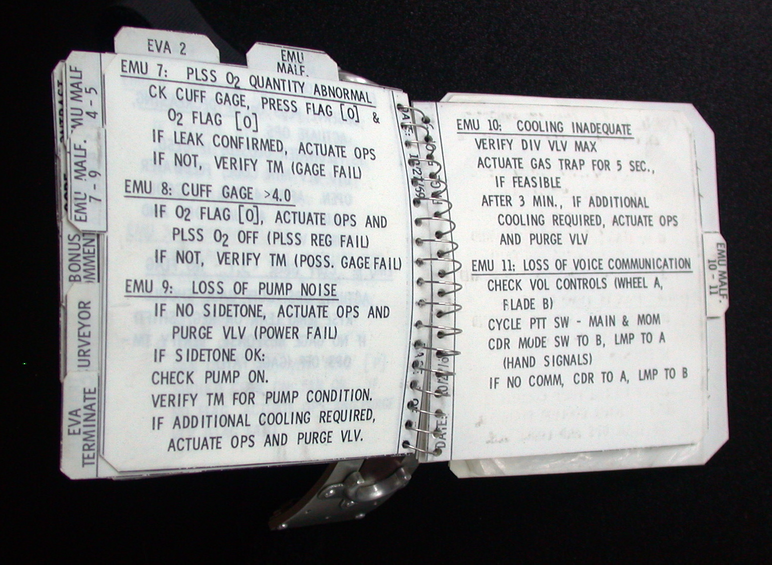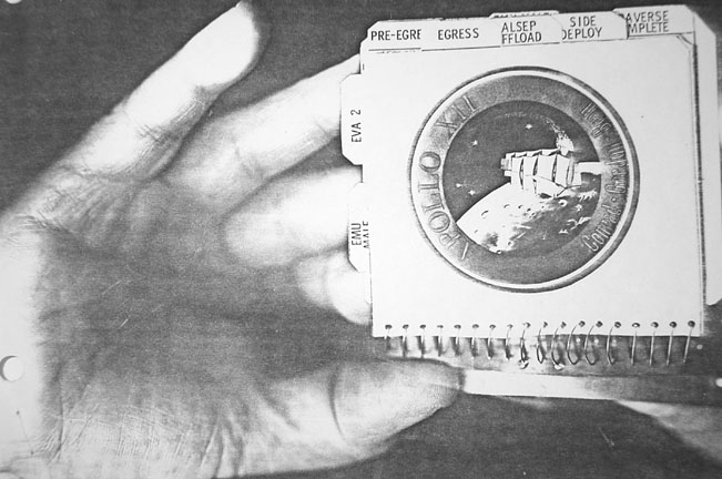 Wrist cuff manuals held the step-by-step procedures for each of the astronauts’ extra-vehicular excursions. Ernie Reyes, chief of pre-flight operations for NASA back on Earth, spiced up the checklists with little “Snoopy” cartoons. Snoopy, from Peanuts, was an unofficial mascot of the Apollo program (their black and white radio caps were named after the dog).